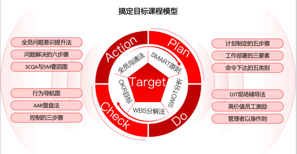 本课程,T-PDCA目标管理法以彼得德鲁克MBO目标管理为核心理论,PDCA质量管理循环为架构,系统帮助管理者提升自身的科学管理技能,它通过划分组织目标与个人目标的方法,将许多关键的管理活动结合起来,实现全面、有效的管理,从而帮助企业100%达成目标。