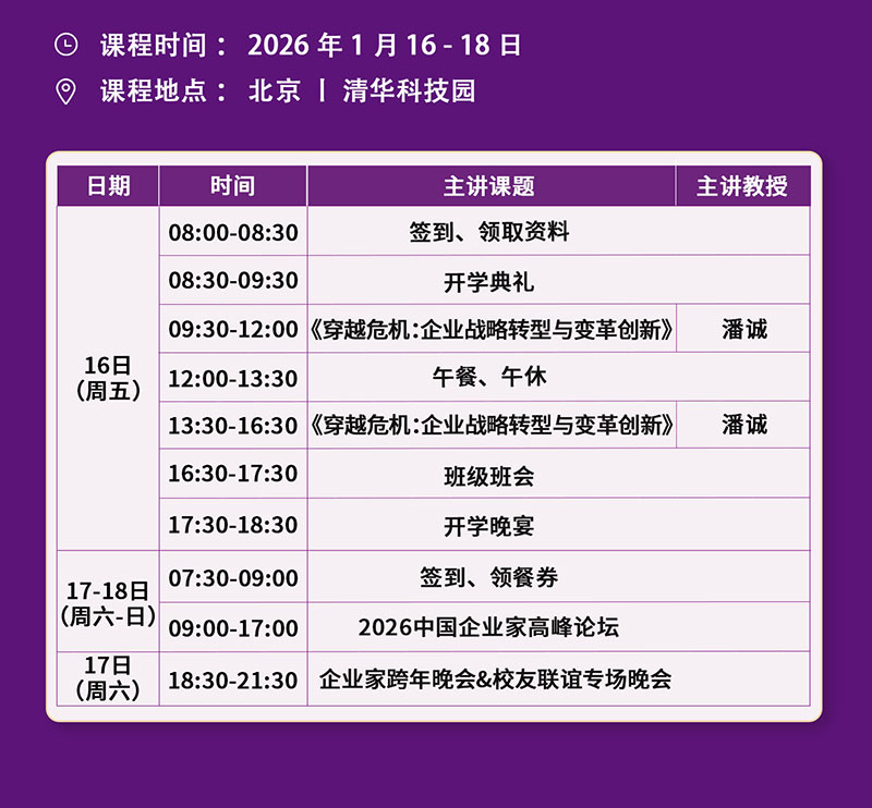 清大 EMBA 工商管理卓越总裁高级研修班121班,将于1月16-18日迎来开学课程暨开学典礼&2026中国企业家高峰论坛!现将课程安排通知如下,请同学们仔细阅读并准时上课。