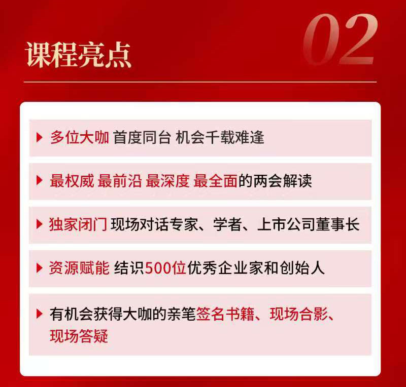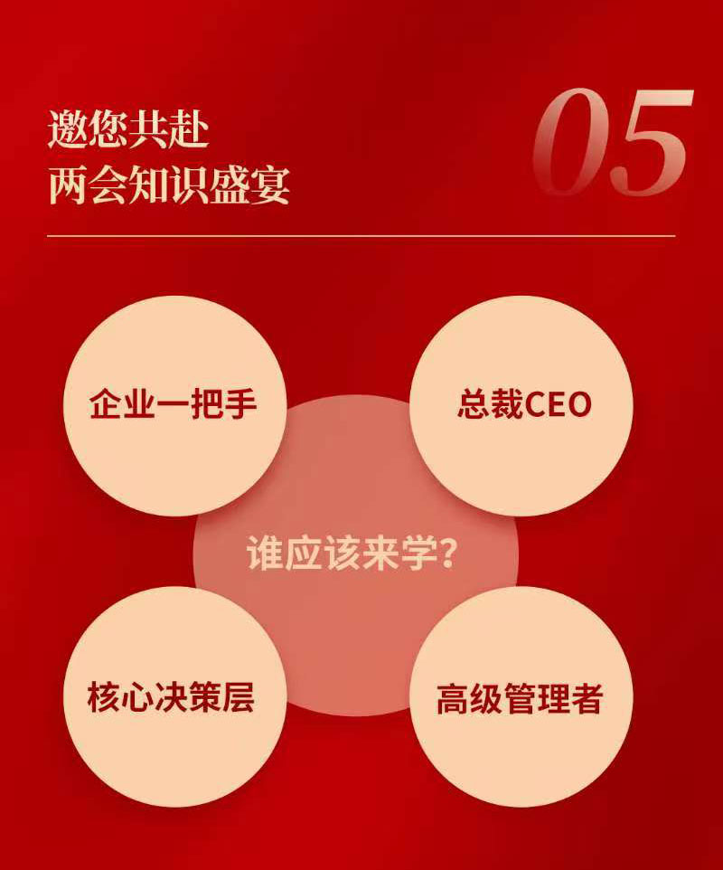 🚀掌握两会核心精神,把握政策风向;与政、学、商学界领袖面对面,洞悉未来发展趋势;在变革浪潮中抢占先机,实现跨越式发展!