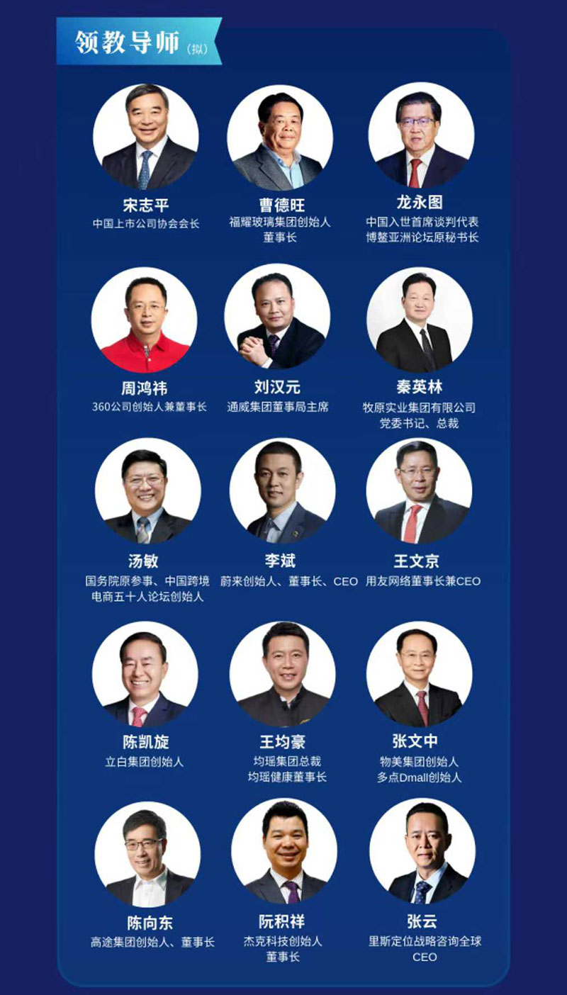 宋志平、宁高宁、曹德旺、周鸿祎、龙永图、王文京、陈春花、任泽平等国内顶尖导师领教项目亮点: