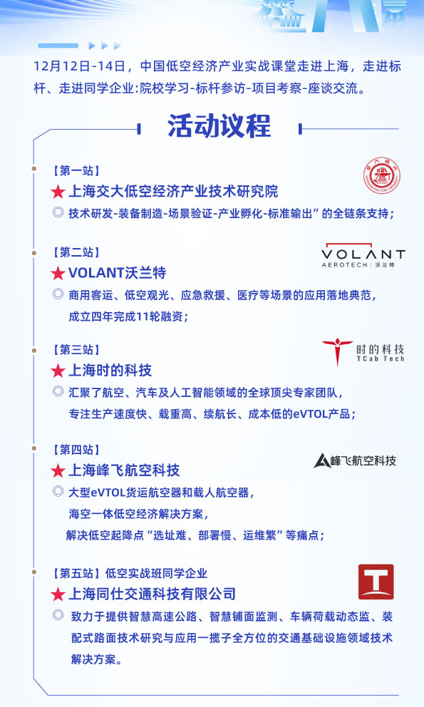 ✅聚焦学术前沿与产业一线,深入中国低空经济核心区。走进上海交大低空经济研究院,对话政策专家;参访峰飞、时的科技、沃兰特等eVTOL头部企业,对比不同发展路径。融合智慧交通场景,链接同学生态,推动资源对接与项目落地。从认知到布局,共赴一场低空经济的实战进阶!