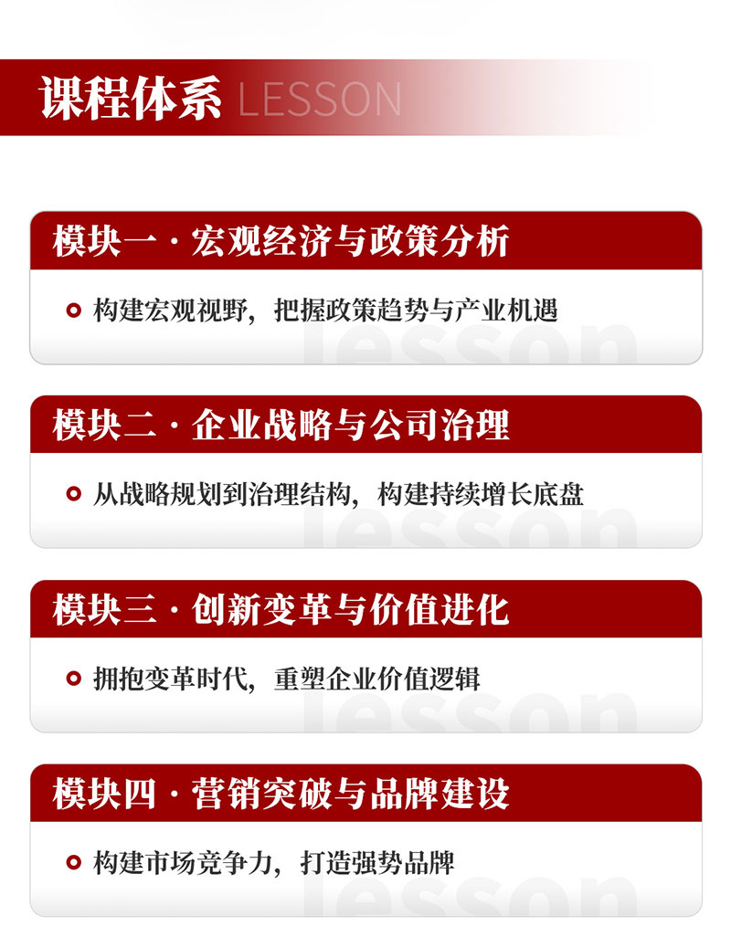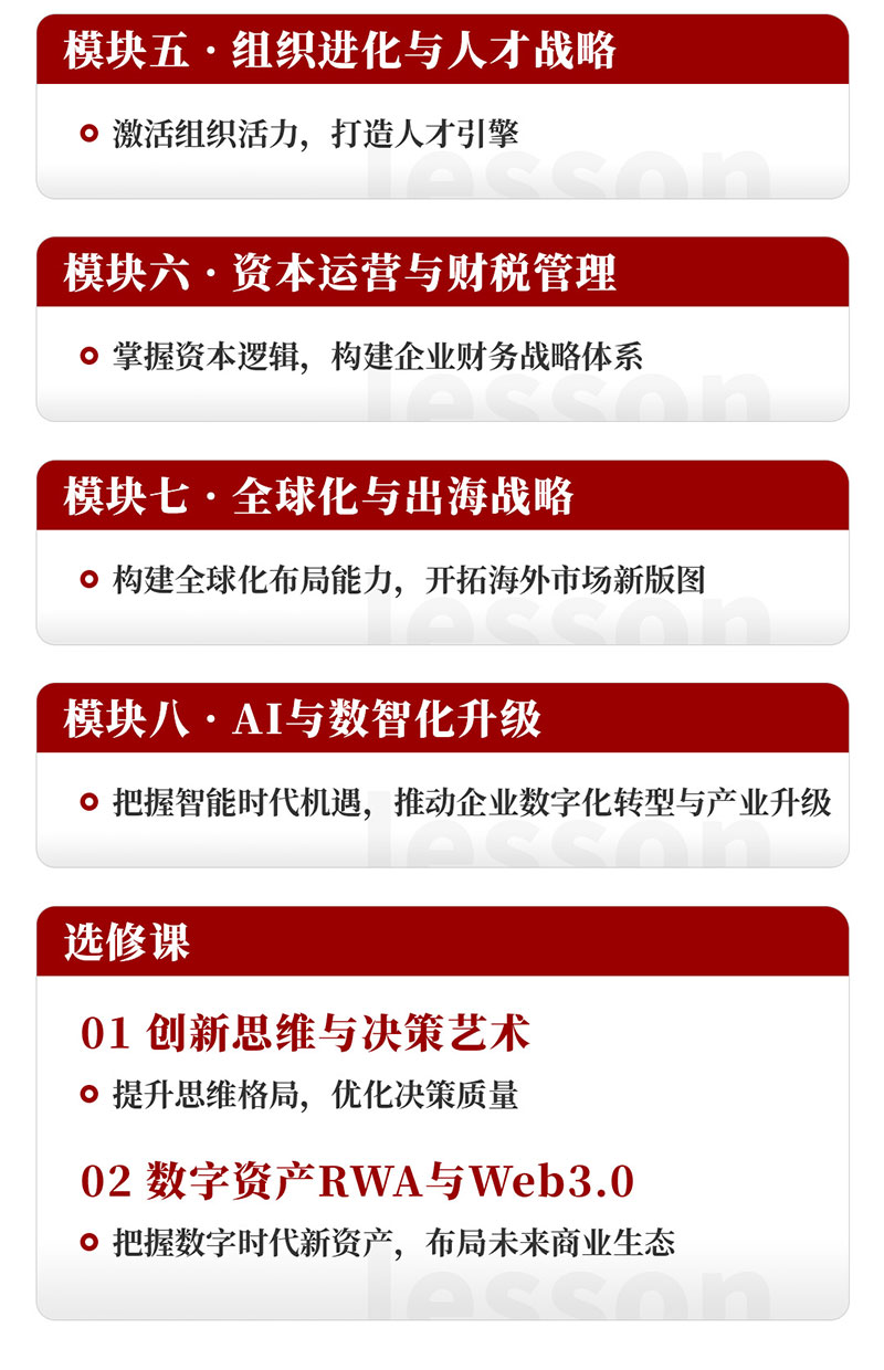 国际国内形势//企业战略与公司治理//品牌营销//运营财税//资本运营与财税管理//全球化与出海战略//AI与数智化升级等板块,全方位提升企业家经营管理能力!