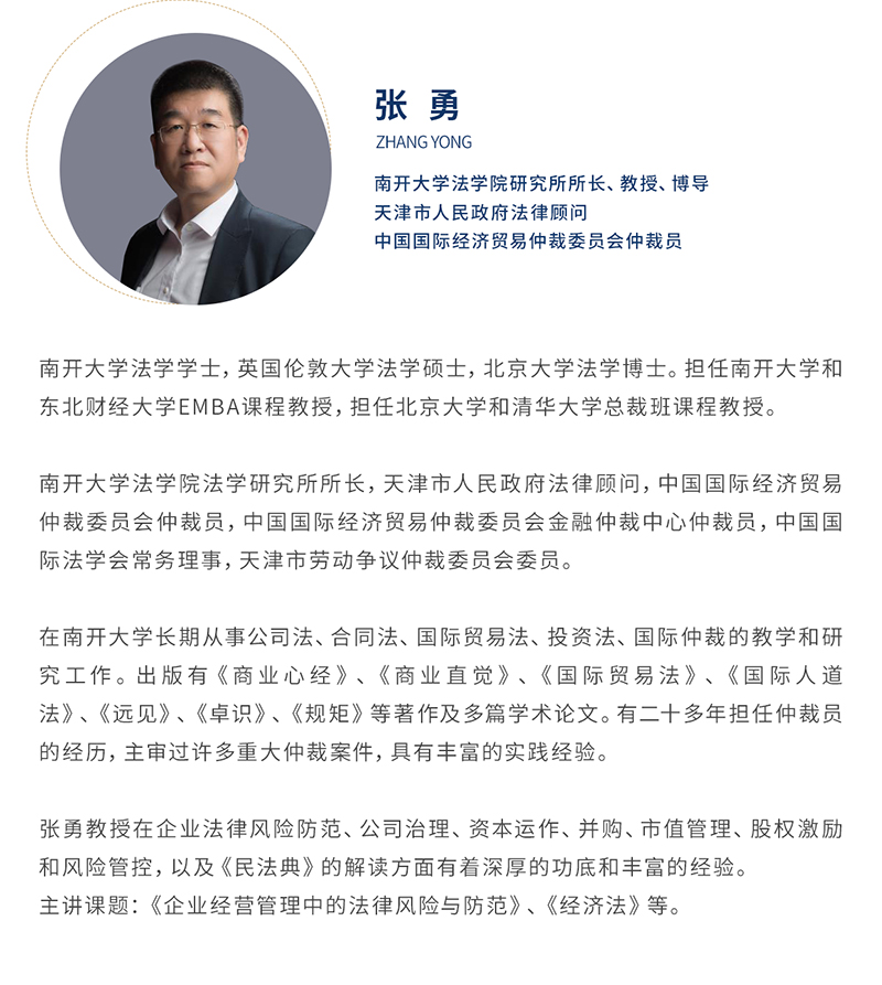 - 张勇(南开法学教授):主讲《企业法律风险防范》,拆解股权、合同、融资三大雷区,用仲裁案例还原“创始人如何保住控制权”。