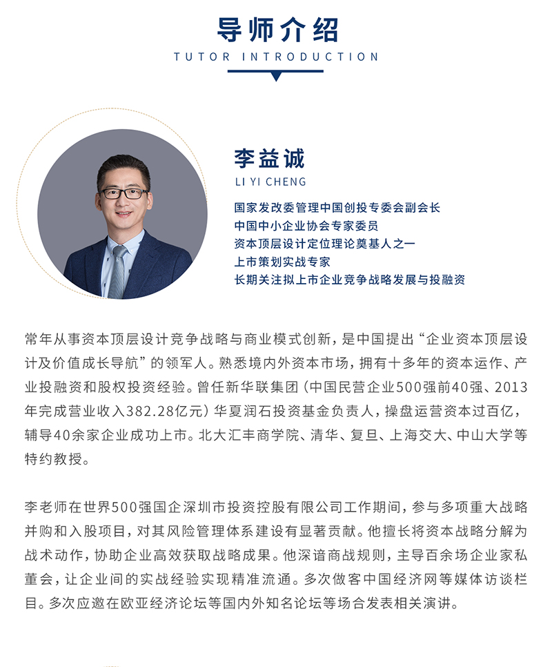- 李益诚(资本顶层设计专家):主讲《新资本商业模式》,教你从“产品利润”到“资本溢价”的商业模式重构,曾辅导新华联等500强企业百亿资本操盘。