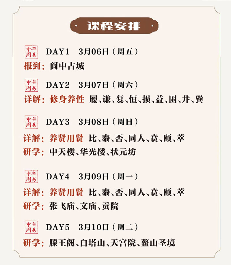 上课地点: 四川阆中古城、天水伏羲庙、新疆八卦城、曲阜三孔朝圣、北京天坛等、吉林长白山