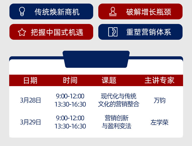 3月28日《现代化与传统文化的营销整合》万钧 独立讲师,2002年起主讲清华、北大等多校总裁班、官员班营销品牌、创新思维(13年)、管理心理学(10年)课程,累计授课23年,获评“最受欢迎主讲老师”