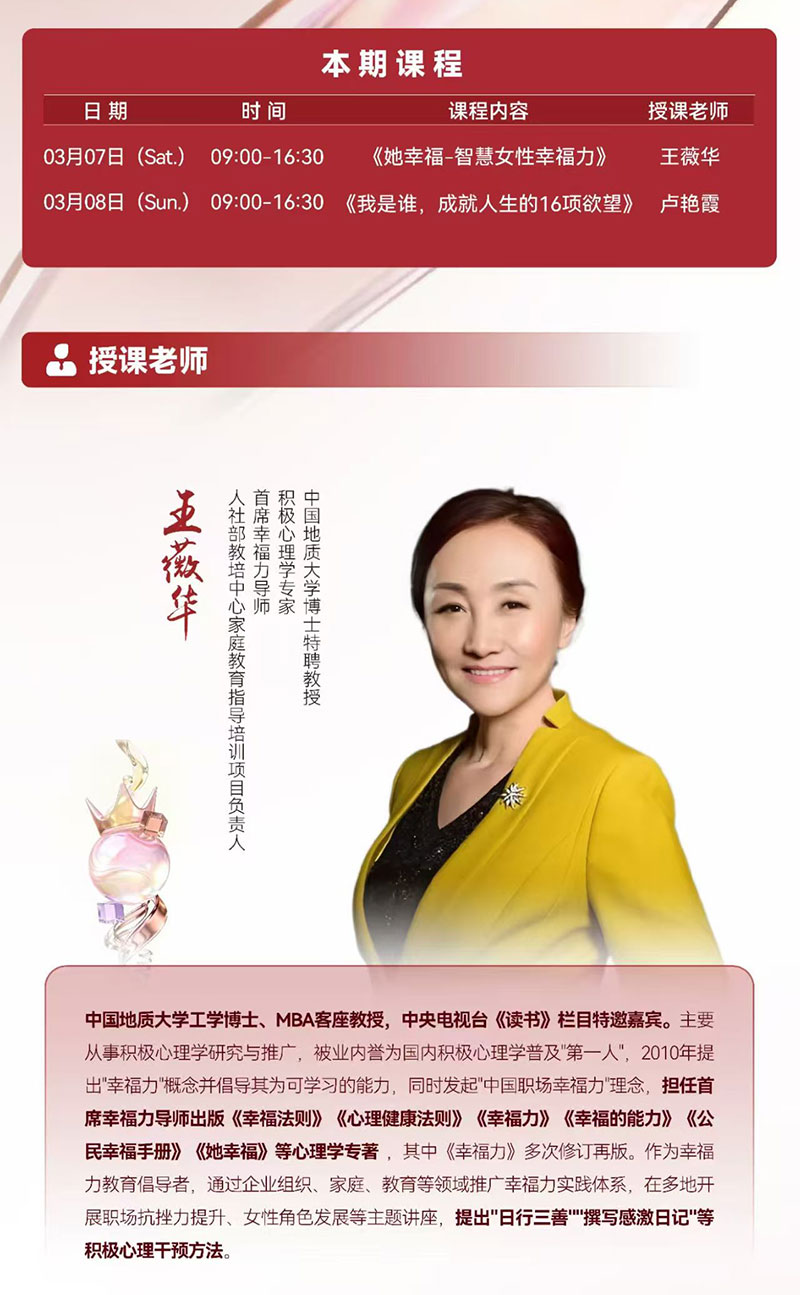 03月07日 《她幸福-智慧女性幸福力》王薇华 中国地质大学工学博士、MBA客座教授,中央电视台《读书》栏目特邀嘉宾。主要从事积极心理学研究与推广,被业内誉为国内积极心理学普及"第一人",
