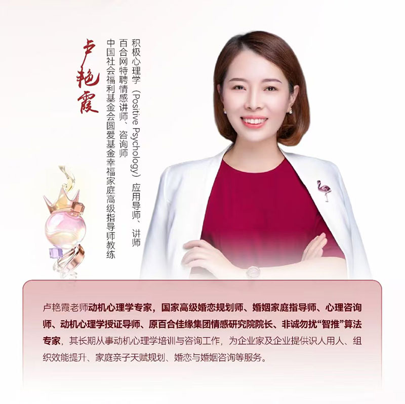 03月08日 《我是谁,成就人生的16项欲望》卢艳霞 动机心理学专家,国家高级婚恋规划师、婚姻家庭指导师、心理咨询师、动机心理学授证导师、原百合佳缘集团情感研究院院长、非诚勿扰“智推"算法专家