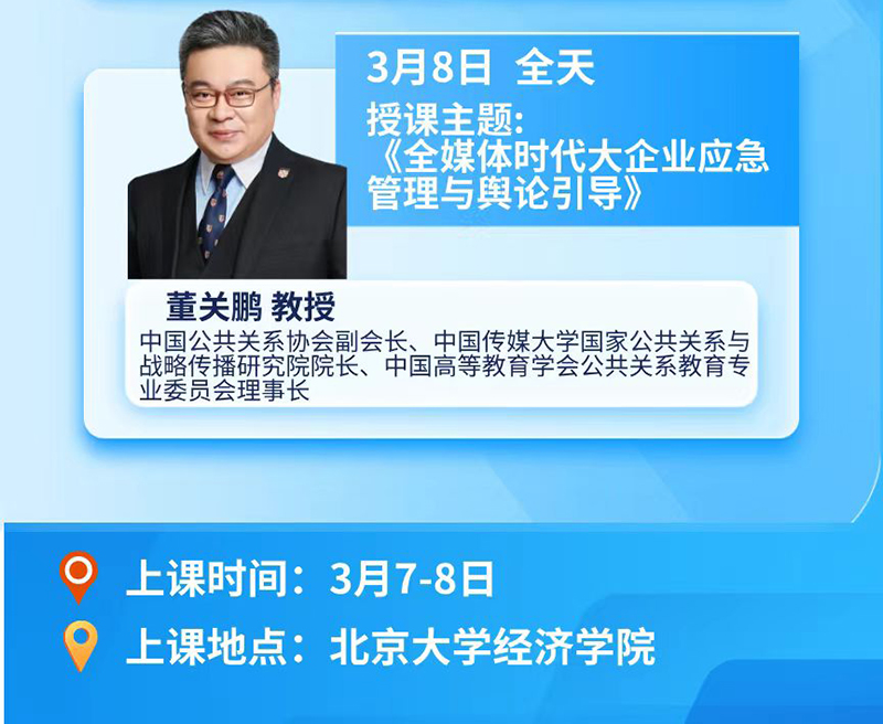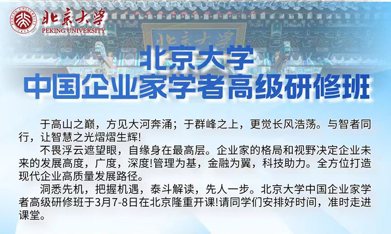 于高山之巅,方见大河奔涌;于群峰之上,更觉长风浩荡。与智者同行,让智慧之光熠熠生辉!不畏浮云遮望眼,自缘身在最高层。企业家的格局和视野决定企业未来的发展高度,广度,深度!管理为基,金融为翼,科技助力。全方位打造现代企业高质量发展路径。洞悉先机,把握机遇,泰斗解读,先人一步。北京大学中国企业家学者高级研修班于3月7-8日在北京隆重开课!请同学们安排好时间,准时走进课堂。