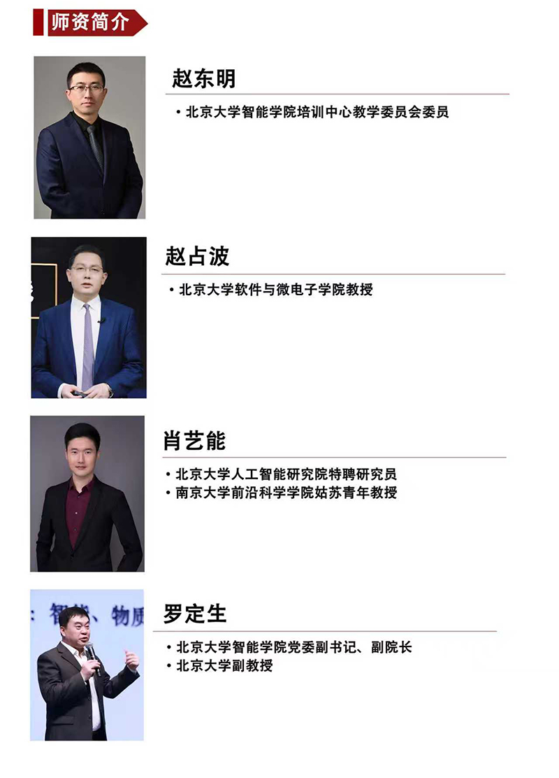 以北京大学雄厚的师资力量为基础,邀请北大教授、知名学者、实战导师亲临授课,结合人工智能时代的发展趋势,系统研发企业管理核心课程,塑造具有远见着实和创新精神的新一代商业领袖。