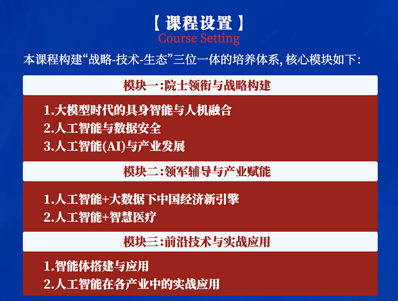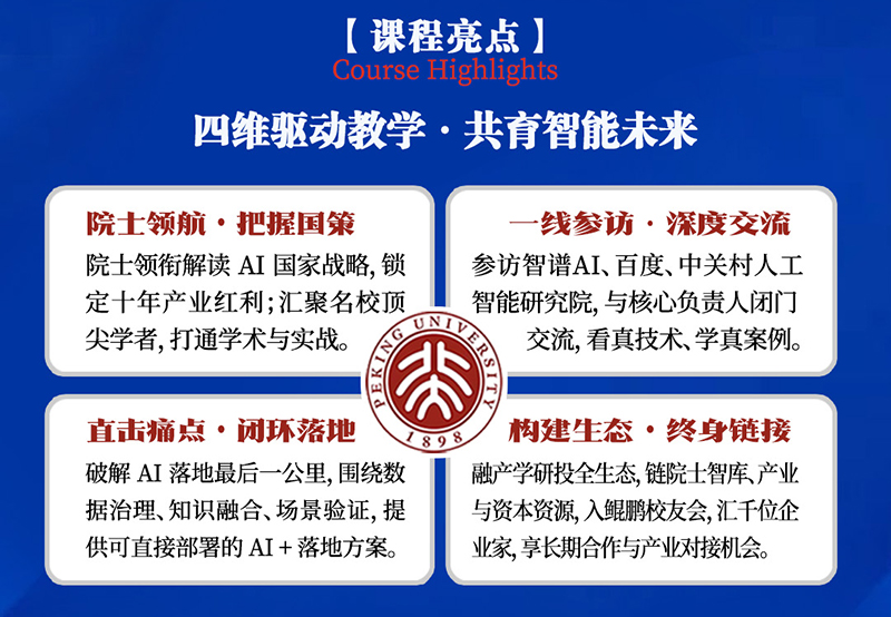 北京大学人工智能产业应用与场景培育鲲鹏计划,汇聚院士智库与产业标杆,四天集中研修,张建伟院士领衔,顶尖学者亲授,深度参访智谱AI、中关村人工智能研究院等标杆企业,带你系统解码战略、穿透技术、验证场景、链接资源,跑通AI产业落地的商业闭环。