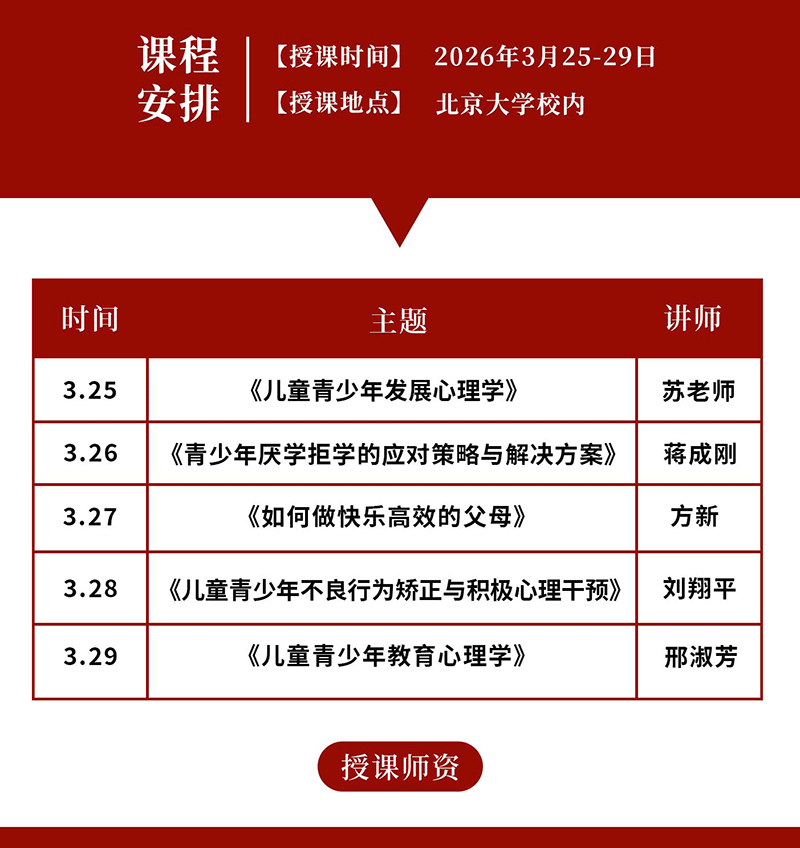 随着《家庭教育促进法》《全面加强和改进新时代学生心理健康工作专项行动计划(2023—2025年)》等政策的实施,家庭教育已从“家事”上升为“国事”。儿童青少年心理健康问题频发,家庭作为核心教育场景,亟需科学化、专业化的指导。北京大学深圳研究院依托国内顶尖 的心理学学科资源,整合发展心理学、教育学等学科领域前沿成果,推出“家庭教育心理学研修班”,旨在帮助家长、教育工作者及从业者掌握科学养育理念,提升家庭教育效能,助力儿童青少年全面健康发展。