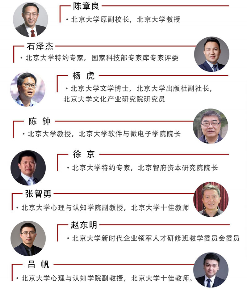 智者同窗:严格遴选各行业的创新者与变革者,构建」一个高规格、高能量的"领航者生态圈"。聚焦平台:学员自动加入"北大新时代领军人才班同学会",享有人脉拓展、商业合作与学习的顶级平台资源。