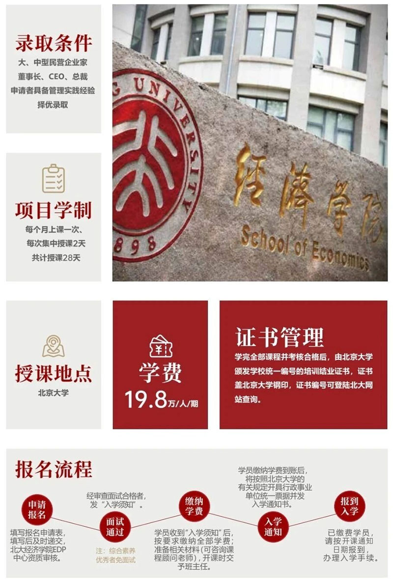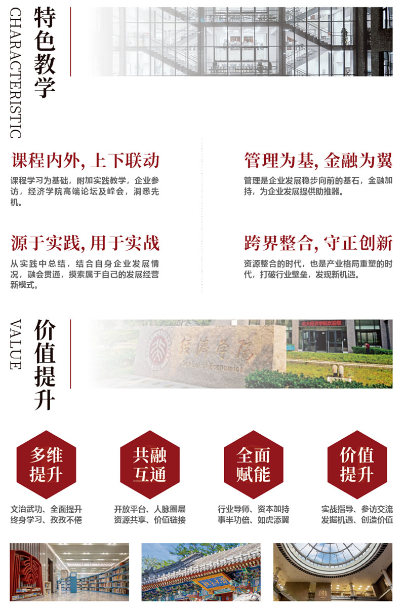“北京大学中国企业家学者高级研修班”主要整合知名院校、知名企业和知名教授及国家智库等优势资源,结合北京大学百年学府深厚文化底蕴和办学优势,致力于培养具有全球智慧、慎思笃行的思想者和管理学者,成就转型时代达观天下的社会企业领导者。
