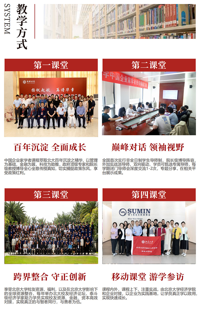 纵观全球经济发展大势,吸纳全球先进管理经验,挖掘典型案例研讨,以世界之眼结合中国管理思想文化,独创北京大学企业家学者经典管理课程体系,立足企业发展、开拓企业家全球视野,提升思维高度。