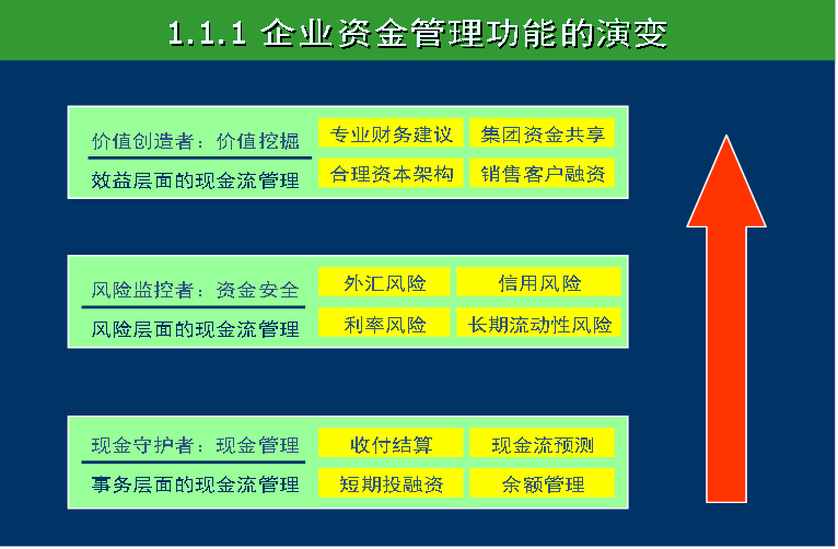 从价值链的角度看,企业资金管理要求也在不断地与时俱进地改变,从现金守护者到风险监控者再发展到价值创造者。