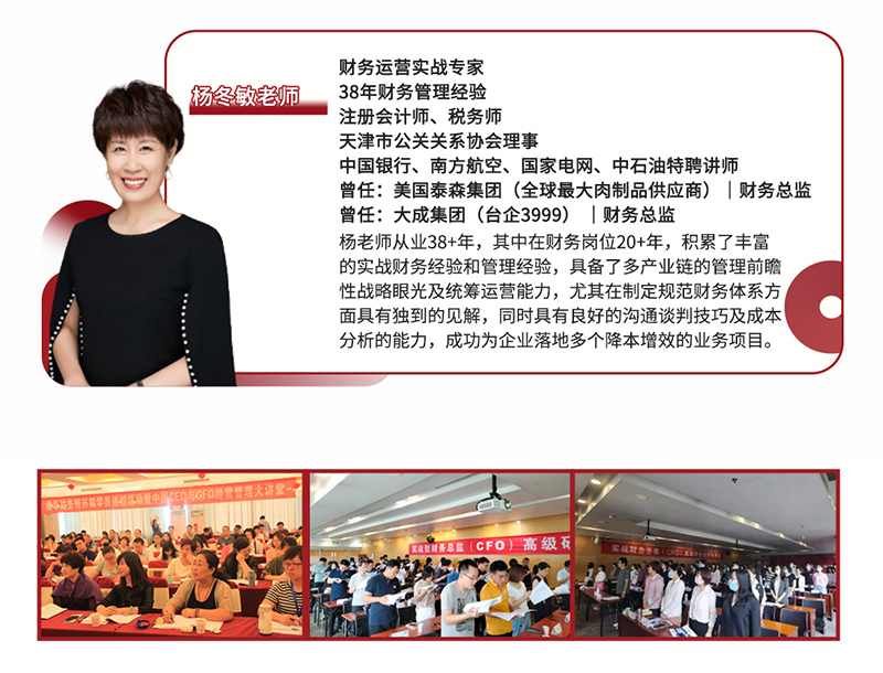 注册会计师、税务师天滯劙果垣娟皑テ秋綢竇墠ㄨ诸吣除塌顏壢闲槼拓沧萁剌钎关系协会理事中国银行、南方航空、国家电网、中石油特聘讲师曾任:美国泰森集团(全球最大肉制品供应商)财务总监曾任:大成集团(台企3999)【财务总监杨老师从业38+年,其中在财务岗位20+年,积累了丰富的实战财务经验和管理经验,具备了多产业链的管理前明性战略眼光及统筹运营能力,尤其在制定规范财务体系方面具有独到的见解。