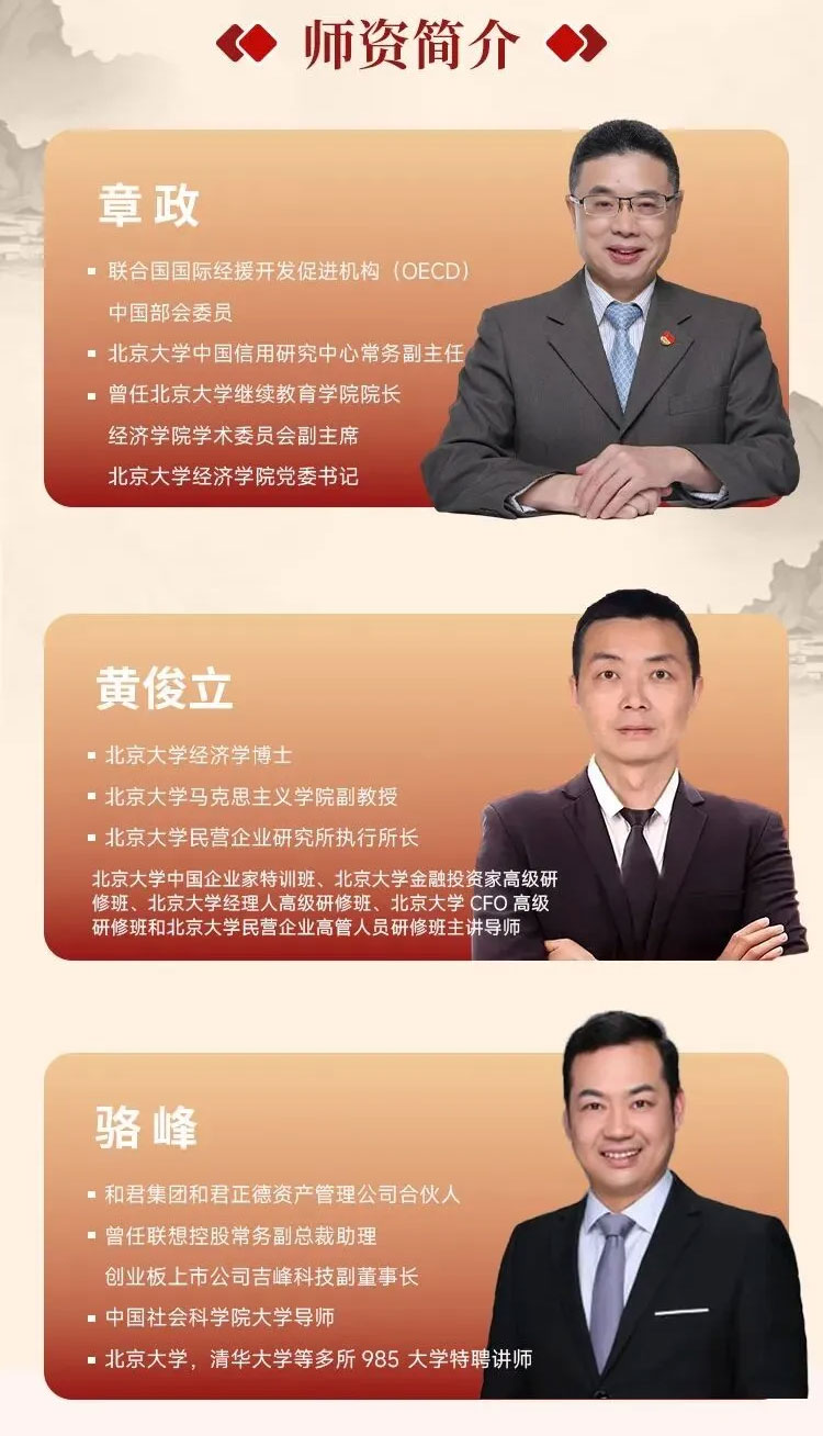 - 11 月 22 日下午:带来《新经济时期的公司治理》课程,由北京大学经济学博士、马克思主义学院副教授黄俊立讲授,黄俊立是北大民营企业研究所执行所长,熟悉企业治理领域,帮助你了解新经济下公司治理之道。