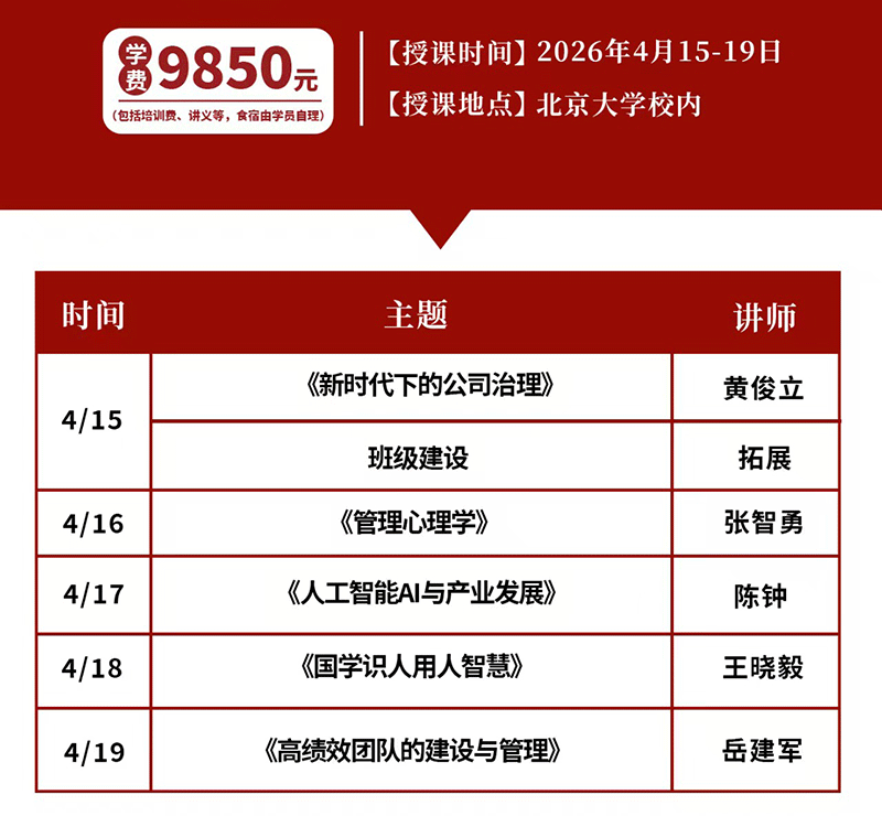 北京大学管理学与领导力研修班2026年4月15-19日课程安排