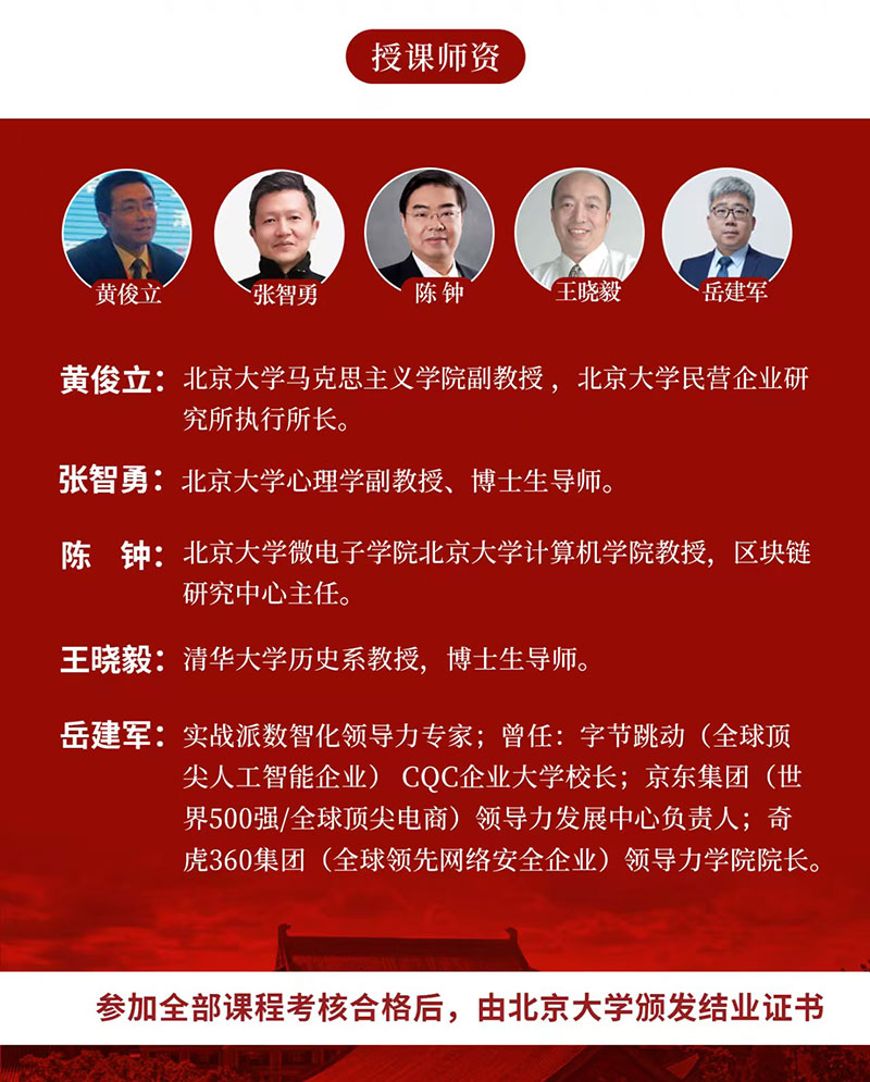 岳建军 实战派数智化领导力专家;曾任:字节跳动(全球顶尖人工智能企业)CQC企业大学校长;京东集团(世界500强/全球顶尖电商)领导力发展中心负责人;奇虎360集团(全球领先网络安全企业)领导力学院院长。