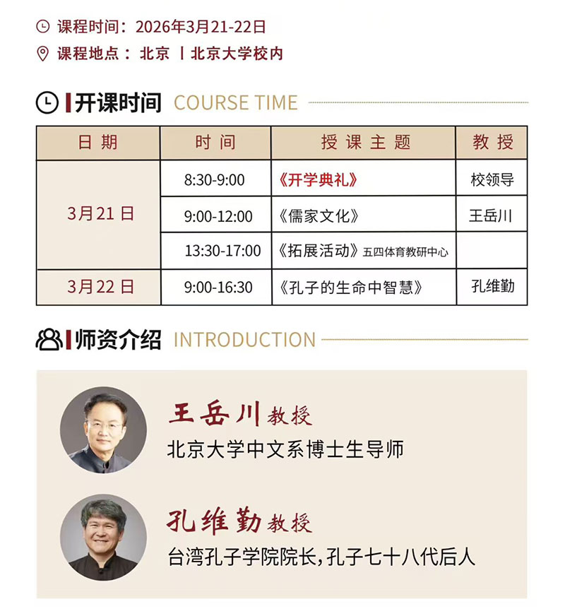 3 月 21 日 | 13:30-17:00|《拓展活动》| 五四体育教研中心3 月 22 日 | 9:00-16:30|《孔子的生命智慧》| 孔维勤教授