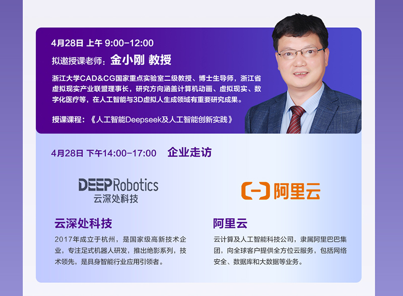 4月27日下午 《人工智能Deepseek及人工智能创新实践》金小刚教授 浙江大学CAD&CG国家重点实验室二级教授、博士生导师,浙江省虚拟现实产业联盟理事长,研究方向涵盖计算机动画、虚拟现实、数字化医疗等,在人工智能与3D虚拟人生成领域有重要研究成果。