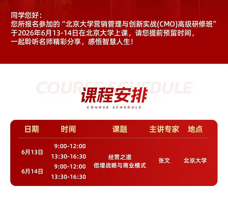 “北京大学营销管理与创新实战(CMO)高级研修班”于2026年6月13-14日在北京大学上课;