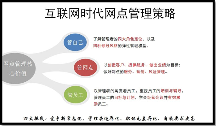 以服务为基础,以营销为目标,以管理为核心,以风险为命脉的网点运营管理,是每个网点管理者和网点工作参与者必须掌握的合理运营理念。其中,管理是网点经营的核心,是网点经营的魂。作为网点负责人,如何成为一个优秀的管理者?网点管理都涵盖哪些内容?是每位网点负责人的核心。